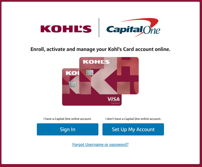 - Launch your Google Chrome or Safari and Head to Kohls.capitalone.com. Tap Sign In.